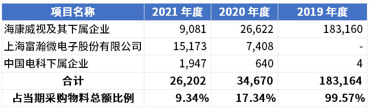 2019年及以前,海康威视及其下属企业是萤石网络第一大供应商,2018年至2021年,萤石网络向海康威视及其下属企业采购材料、商品的金额分别为9.6亿元、18.32亿元、3.47亿元和2.62亿元,占各期采购物料总额比例分别为100%、99.57%、17.34%和9.34%。