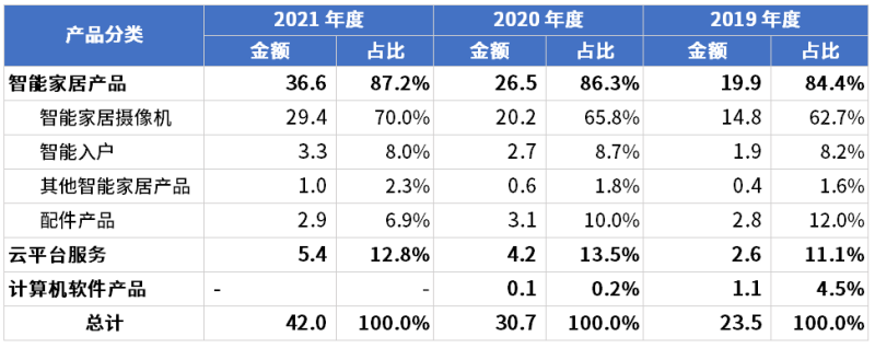 智能家居中摄像机占比超70%+,2019-2021 销售收入分别为14.8、20.2、29.4 亿元,占主营收比重 62.7%、65.8%、70.0%,主要代表产品室内云台系列、室外防水系列、卡片机系列、室外云台系列和电池相机系列。其产品性能领先,公司主推品质产品,在视频图像处理、音频处理、云台技术、智能化程度等方面,公司产品与竞品相比优势较为明显。同时,公司产品具备更大的存储容量支持和更多的联网方式选择。