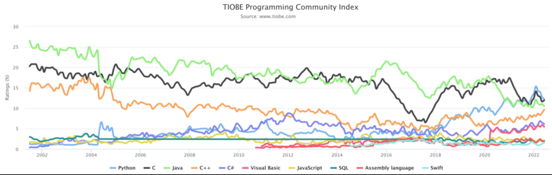 图 1 – 过去 20 年编程语言指数排名,源自TIOBE 编程社区,其中C一直是排名前两位的语言之一。
