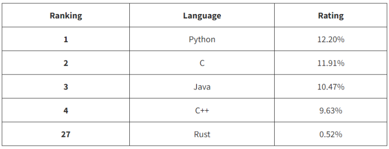 使用其他语言来支持 C 可能已经发生。例如,下面的表 1 显示了几种语言在 TIOBE 指数中的排名。过去,一两种语言主导着计算机科学。如今,前四种语言的评分都在 10% 左右。这表明单一主导语言的终结。相反,开发人员将利用多种语言来实现他们的最终目标。