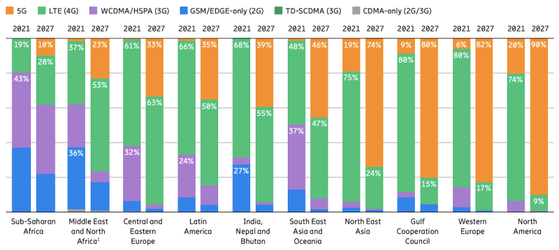 图:全球不同地区不同移动通信技术的移动用户数量。资料来源:爱立信。