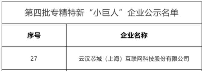 2022年8月8日,上海市经济和信息化委员会网站公示工业和信息化部第四批专精特新“小巨人”名单,云汉芯城入榜国家级第四批专精特新“小巨人”企业!