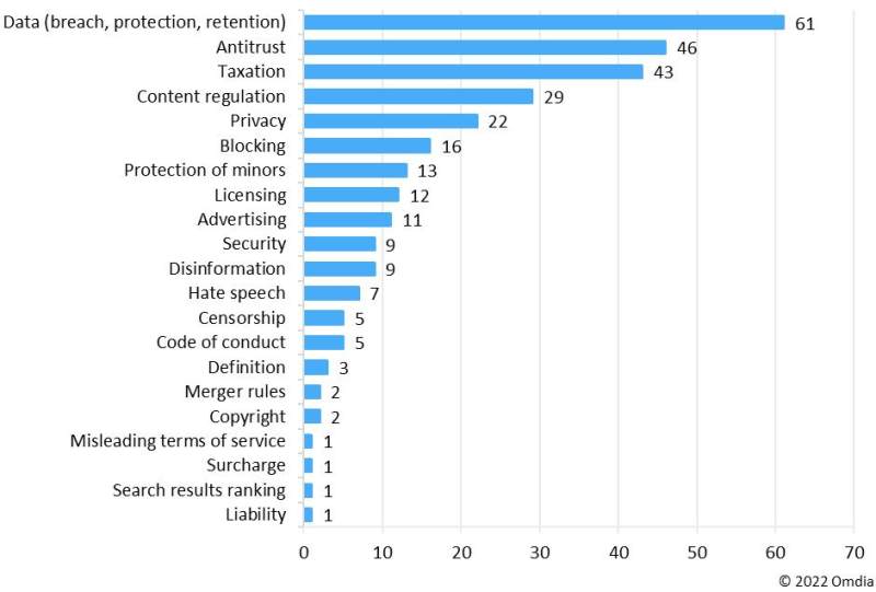 图1:公开宣布的针对数字技术平台的监管举措,按照主题划分,2022年上半年。