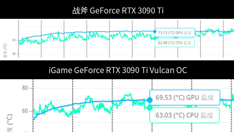 为了进一步证实真空冰片会有更优秀的散热效率,本次测试拿出采用了铜底直触方案的战斧 GeForce RTX 3090 Ti 及使用真空冰片方案的 iGame GeForce RTX 3090 Ti Vulcan 进行对比。