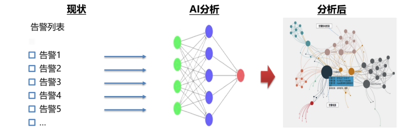 针对网络中产生的多个异常告警,通过专家经验、AI分析,获取告警间关系图谱,查找引起告警的根源基于告警根源分析结果,分析可导致的其他异常,提高告警处理效率,并通过提前处理异常,防止业务中断影响生产。