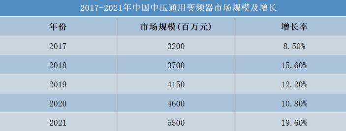 2021年作为“十四五”规划的开局之年,虽然受能源双控和环保高压的影响,叠加汛情、疫情、台风、限电等因素影响,下游投资有所减缓,但全年宏观政策跨周期调节扎实推进,中国经济持续稳定恢复,能源清洁低碳转型深入推进,产业升级、结构优化持续发力,中高压通用变频器市场呈现高速增长。2021年中国中高压通用变频器整体市场规模为55亿元,同比增长19.6%。