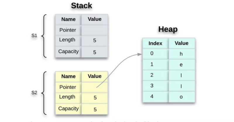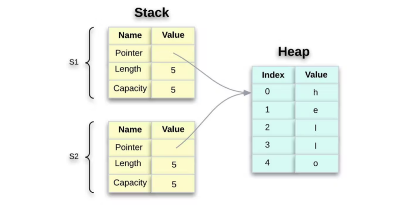 与栈不同,当我们将数据存放到堆上时,需要请求一定的内存空间。内存分配器在堆中定位一个足够大的未占用空间,并将其标记为正在使用,同时返回该位置地址的引用。这就是内存分配。