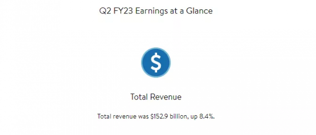 沃尔玛发布第二季度财报,数据显示,二季度沃尔玛总营收为 1529 亿美元,同比增长 8.4%;Q2 营业利润为 69 亿美元。