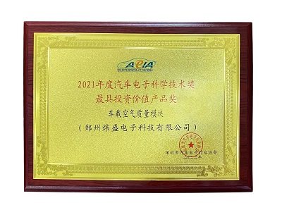在此次年会上,炜盛科技车载空气质量模块荣获2021年度汽车电子科学技术奖优秀创新产品奖和最具投资价值产品奖两项荣誉。