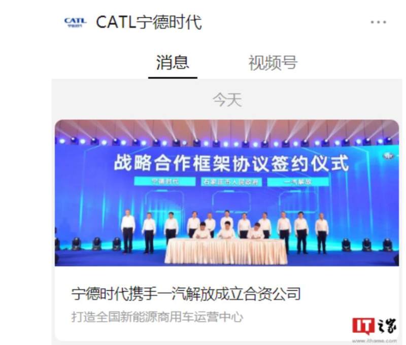 8 月 18 日消息,8 月 18 日,宁德时代与一汽解放合资公司揭牌暨签约仪式在石家庄市正定县举行,宁德时代与一汽解放共同成立解放时代新能源科技有限公司。