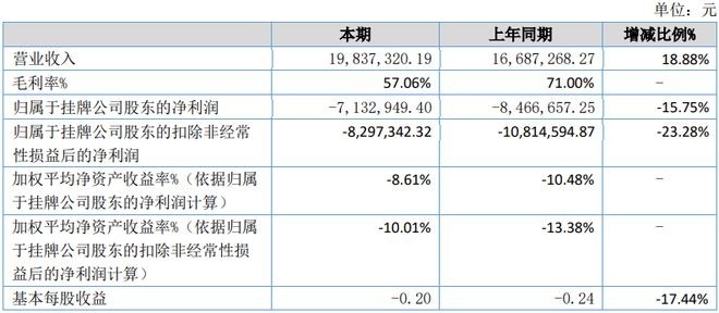 【仪表网 企业财报】8月18日,纽迈分析(836507)发布2022年半年度报告,报告期内公司实现营业收入19,837,320.19元,同比增加18.88%;归属于挂牌公司股东的净利润-7,132,949.40元,同比亏损减少。