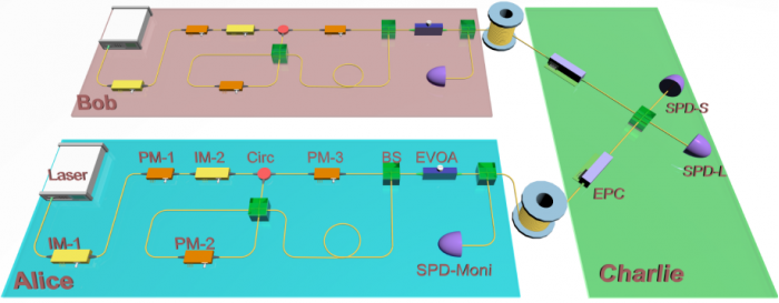 为推进新一代量子密钥分发技术的实际应用,韩正甫团队通过将源端常见的非理想特性纳入安全性证明框架中,提出了兼具高稳定性和高安全性的测量设备无关协议——误差容忍测量设备无关协议。该协议在免除了对探测端所有安全假设的同时,还免除了源端的“单光子态不可区分假设”和“纯态假设”。由于免除了这两条假设,测量设备无关协议对量子态调制中的信号畸变和噪声具有极强的容忍能力。经过严格的安全性分析,该团队证明了这些源端设备的非理想特性不会破坏测量设备无关协议的安全性,也不会降低系统的安全密钥生成速率,因此误差容忍协议兼具高安全和高稳定两大特性。