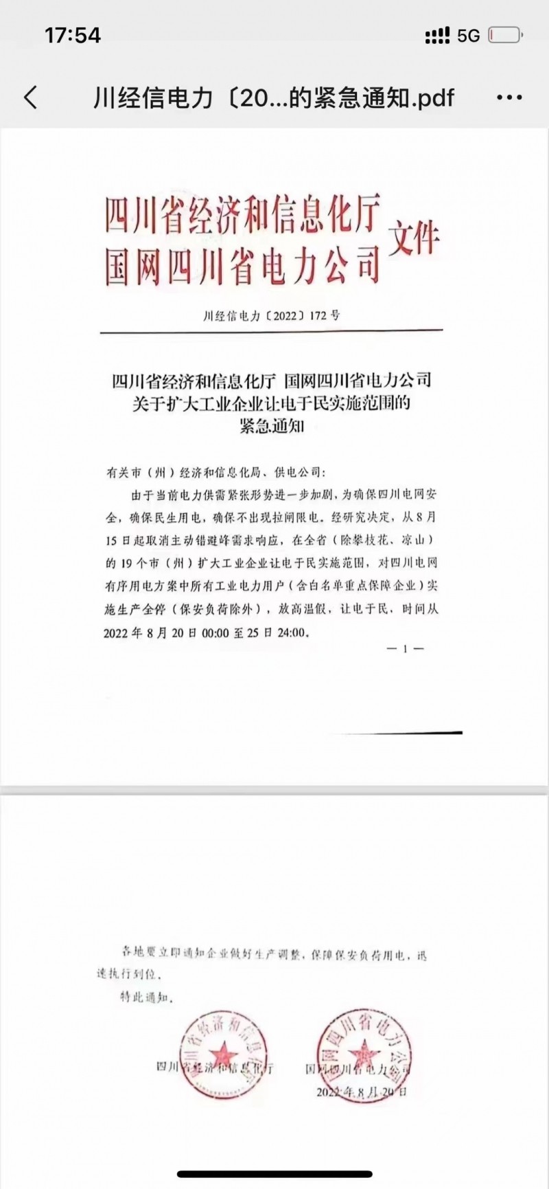8月20日,四川经信厅、国网四川电力公司发布的一份《关于扩大工业企业让电于民实施范围的紧急通知》称,由于当前电力供需紧张形势进一步加剧,为确保四川电网安全,确保民生用电,确保不出现拉闸限电,从8月15日起,在全省(除攀枝花、凉山)扩大工业企业让电于民实施范围,对四川电网有序用电方案中所有工业电力用户(含白名单重点保障企业)实施生产全停(保安负荷除外),放高温假,时间从8月20日0点至8月25日24点。