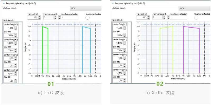 图 4 所示的多波段 SAR 架构采用了脉冲雷达方案。因此,连接接收链的两根天线各使用一个环行器。与 DAC 输出类似,在使用两个工作在相同的 12GHz 采样时钟的 ADC 对接收信号放大和数字化之前,需先对其进行 L+C 通道的低通滤波和 X+Ku 通道的双波段滤波。
