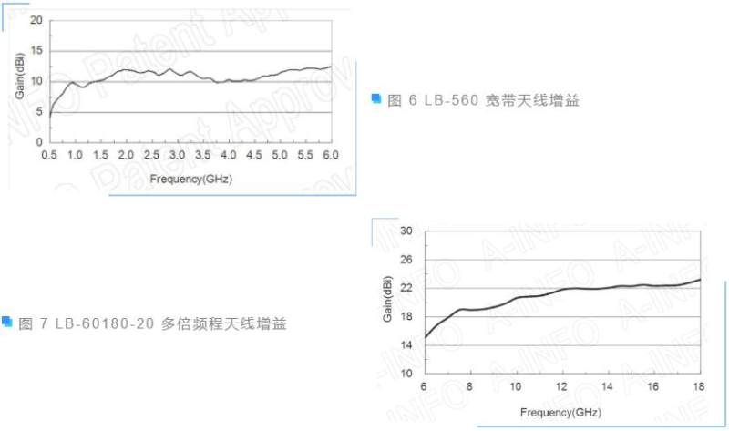 对于机载应用,L 波段和 C 波段可使用宽带喇叭天线(如 Ainfo LB-560[6])进行发射和接收,这款天线支持0.5-6GHz 的频率范围的 10-12dBi 的恒定增益,如图 6 所示。另一方面,多倍频程喇叭天线(如 Ainfo LB-60180-20[7])拥有 6-18GHz 的带宽,支持 X 波段和 Ku 波段,X 波段的增益约为 20dBi,Ku 波段的增益约为 22dBi,如图 7 所示。