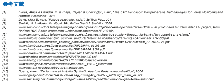 未来我们将会对系统性能进行更详细的分析,包括脉冲响应、相位线性度和杂散水平,然后进行所述的机载多波段SAR 演示样机的开发工作。这个演示样机是更广阔的技术路线图的第一步。我们期待未来会有更新的设计,并由新 的宇航机构和私营公司推动航天载荷的发展。