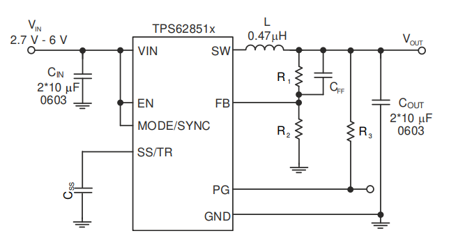 TPS62851x 是一系列引脚对引脚 0.5A、1A、2A(连续)和 3A(峰值)高效率、易于使用的AP1122EG-13同步降压 DC/DC 转换器,它们基于峰值电流模式控制拓扑。低电阻开关允许高达 2A 的连续输出电流和 3A 的峰值电流。开关频率在内部固定为 2.25 MHz,也可以与 1.8 MHz 至 4 MHz 范围内的外部时钟同步。在 PWM/PFM 模式下,TPS62851x 在轻负载时自动进入省电模式,以在整个负载范围内保持高效率。TPS62851x 在 PWM 模式下提供 1% 的输出电压精度,有助于设计具有高输出电压精度的电源。SS/TR 引脚允许设置启动时间或跟踪外部源的输出电压。