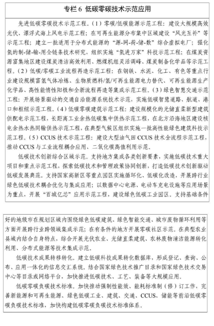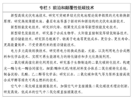 新型绿色氢能技术。研究基于合成生物学、太阳能直接制氢等绿氢制备技术。06 低碳零碳技术示范行动