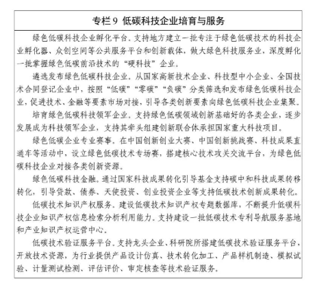 碳达峰碳中和技术实验室体系。在可再生能源、规模化储能、新能源汽车等绿色低碳领域加强国家重点实验室建设。09 绿色低碳科技企业培育与服务行动