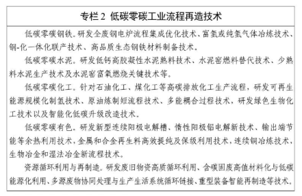 氢能技术。研发可再生能源高效低成本制氢技术、大规模物理储氢和化学储氢技术、大规模及长距离管道输氢技术、氢能安全技术等;探索研发新型制氢和储氢技术。02 低碳零碳工业流程再造技术突破行动