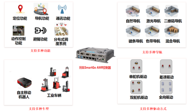 科钛核心SmartGo AMR控制器,是我司自主研发、具备完整知识产权和国际竞争力的自主移动机器人及工业车辆的车载控制系统。该系统以工控机为内核,具有高度集成性、高稳定性及高通用性等特点。科钛SmartGo AMR控制器支持多种常用导航方式并兼容各种主流硬件型号,实现各种机械结构与功能需求的导航运动控制,广泛适用于各类AMR与工业车辆。
