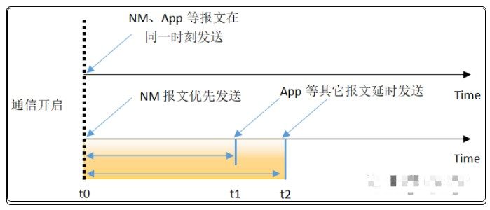 如果让每个周期性App报文,偏移(Offset)一段时间(t1、t2等)发送,而不是在t0时刻抢占NM报文,则可以让NM报文优先发送。