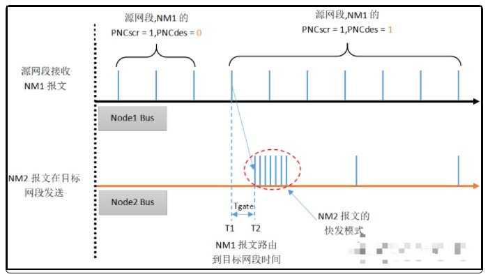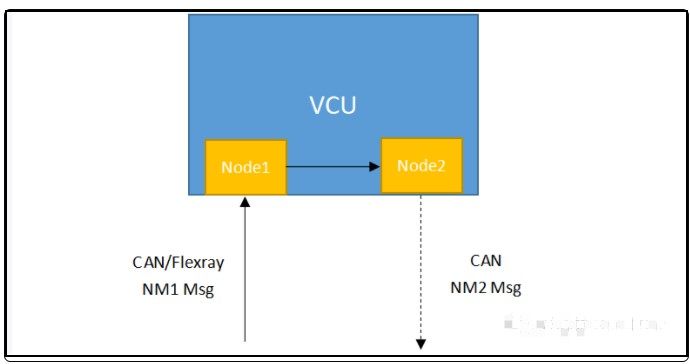 如下图,Node1所在CAN/Flexray总线接收网络管理报文NM1,该网络管理报文在VCU内部转发给Node2(Node2连接CAN总线),如果收到的NM1包含Node2的PNCdes置位,则Node2网络唤醒,且Node2发送网络管理报文NM2。这里使用了PN的GateWay功能。