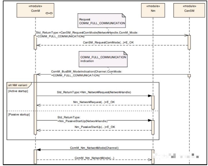 时,信息由CanNM通知到ComM,ComM切换到FULL_COMMUNICATION,这个过程实际只是一个状态切换指令下发,真正做状态切换的是CanSM,而CanSM状态机的切换需要时间,切换状态后通知到ComM,