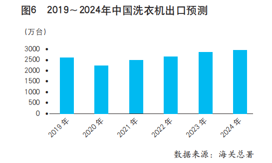 2020年,新冠疫情的影响波及全国乃至各行各业,对于家电等制造行业,疫情的影响也比较明显,工厂复工推迟、物流运输滞缓、上门服务受阻、家电消费锐减。从内销来看,疫情主要影响的是需要安装的机型,进而影响消费者购买力;从出口来看,一是运输受阻,二是出口目的国消费购买力严重下滑,民众消费意愿向疫情需要的防护品转移,对耐用消费品不关注或关注较少。同时,企业复工成本高企,洗衣机外贸议价能力将持续走低,预计2020年中国洗衣机出口很难维持2019年同期的水平(见图6)。全球疫情如能在2020年底前缓解,2021年将是中国洗衣机出品市场反弹的一年,后续将继续稳步发展。