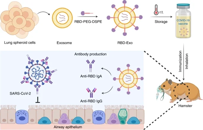 在啮齿动物模型中,RBD装饰的LSC-Exo疫苗(RBD-Exo)引起了对RBD的特异性抗体的产生,并在两剂疫苗后保护啮齿动物免受SARS-CoV-2活体感染。此外,RBD-Exo疫苗在室温下保持了三个月的稳定性。