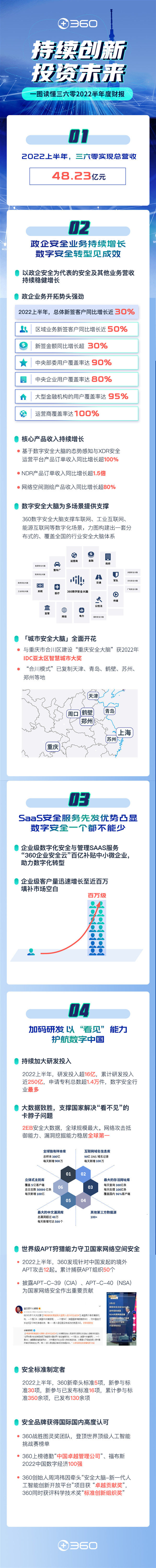 2022年,360公司宣布全面转型数字安全公司,定位“数字安全运营商”,以服务为核心价值,为政府、企业、城市和中小微企业的数字化转型保驾护航。报告显示,2022年上半年,360公司总体新签企业级客户同比增长近30%。截至报告期末,360公司在中央部委的用户覆盖率已达90%,中央企业用户覆盖率达80%,大型金融机构的用户覆盖率达95%,运营商覆盖率达100%。