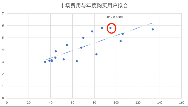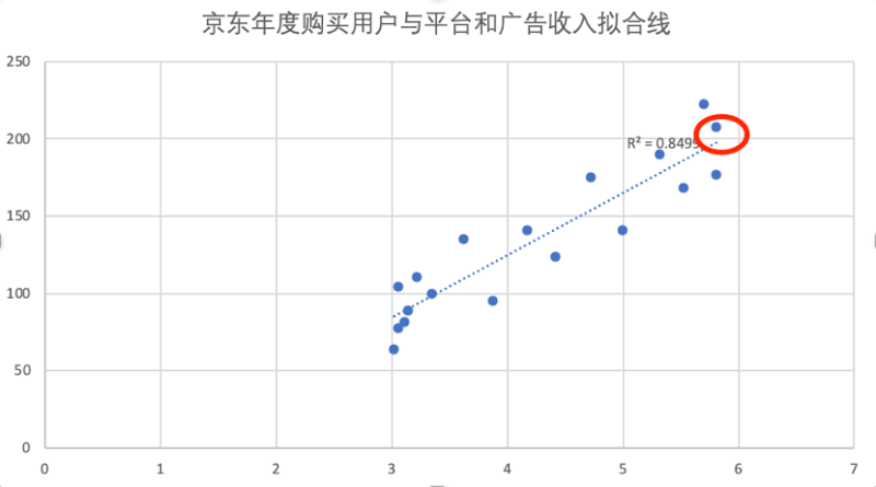 我们将京东年度购买用户与市场费用进行拟合处理,可以直观看到在年度购买用户突破5亿大关,点状分布就开始向拟合线上方移动,当用户规模突破某一临界值后,平台会具有成长惯性,这也是平台经济的一大特点。