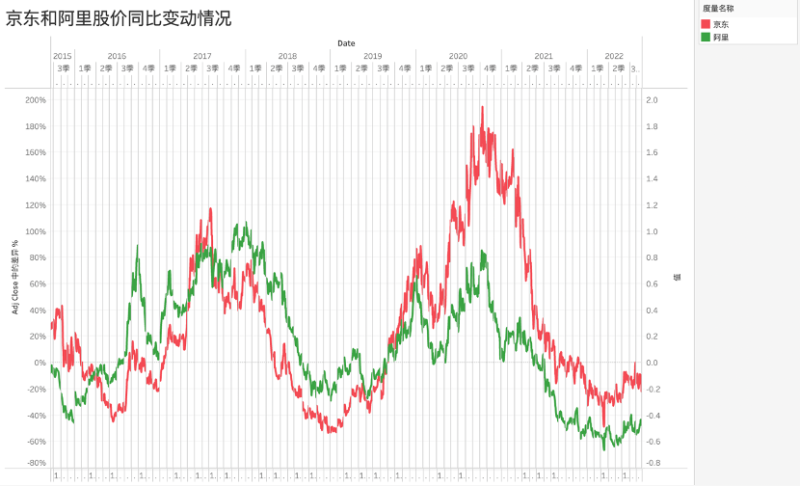 我们整理和分析了京东自IPO之后,股价的同比变动情况,见下图