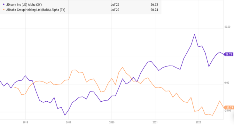 为验证此观点,我们测算京东和阿里两家企业的α值(超额收益,也就是投资跑赢市场的收益),见下图