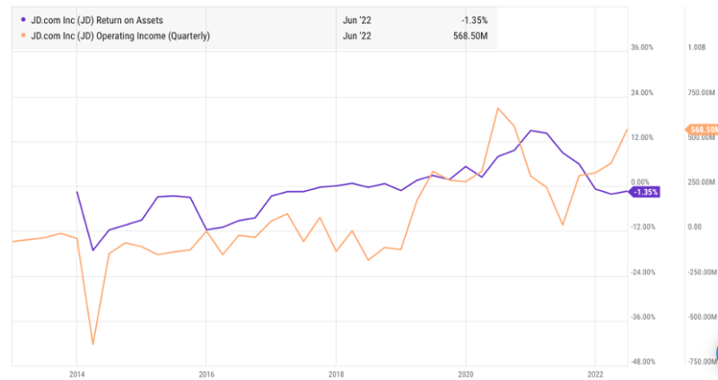 我们整理了京东ROA和经营性利润走势情况,见下图