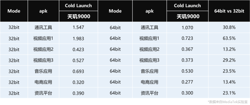 这也就是说在运行32位应用时,只能用到其中的3个核,其他5个核只能处于停工状态,这样一来运行速度和效率就会大打折扣,严重一点可能还会出现增加功耗、应用闪退等问题。至于32位到64位有多大的提升,联发科公布了对比测试,证实64位应用无论是在应用的冷启动速度还是能耗、游戏性能等方面都有显著的提升。
