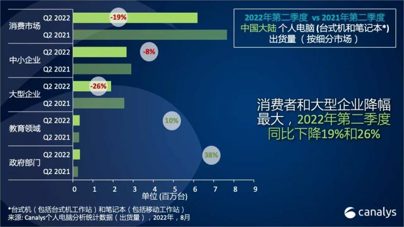 C114讯 8月30日消息(安迪)市场研究机构Canalys发布的报告数据显示,2022年第二季度,中国个人电脑(包括台式机、笔记本电脑和工作站)出货量同比下降16%。其中,台式机(包括台式工作站)和笔记本电脑(包括移动工作站)分别下降了26%和10%。消费和商用领域均受到需求疲软的影响,导致其第二季度的出货量分别下降19%和13%。另外,平板电脑市场取得4%的惊人增长。