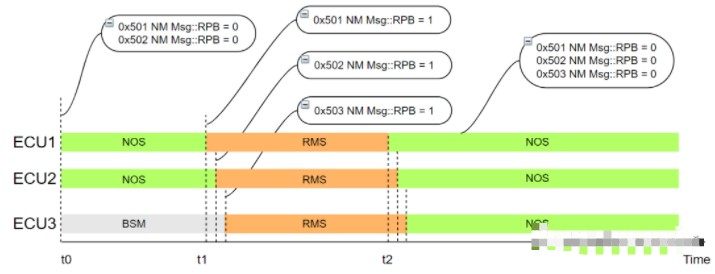 t0时刻:ECU1和ECU2正常通信,两者均处于NOS(Normal Operation State)状态,发送的网络管理报文中,RPB未置位(RPB = 0)。ECU3处于BSM(Bus-Sleep Mode)状态(ECU3具有PN功能,因为收到的网络管理报文中,对应的PNC未置位,所以此时ECU3处于休眠状态)。