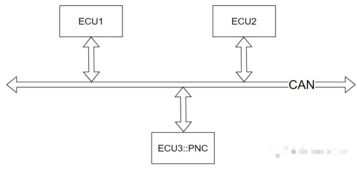 这里我们假设一种工况:某个网段存在3个ECU:ECU1、ECU2、ECU3,且ECU3具有PN功能,ECU1对应的网络管理报文0x501,ECU2对应的网络管理报文0x502,ECU3对应的网络管理报文0x503。三个ECU在总线上的拓扑关系如下所示: