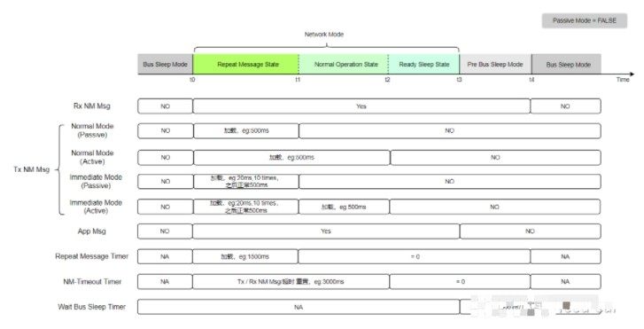 网络管理报文的接收(Rx):在RMS(Repeat Message State)、NOS(Normal Operation State)、RSS(Ready Sleep State)、PBM(Pre Bus-Sleep Mode)状态下均可以接收网络管理报文。BSM(Bus Sleep Mode)无法接收网络管理报文。